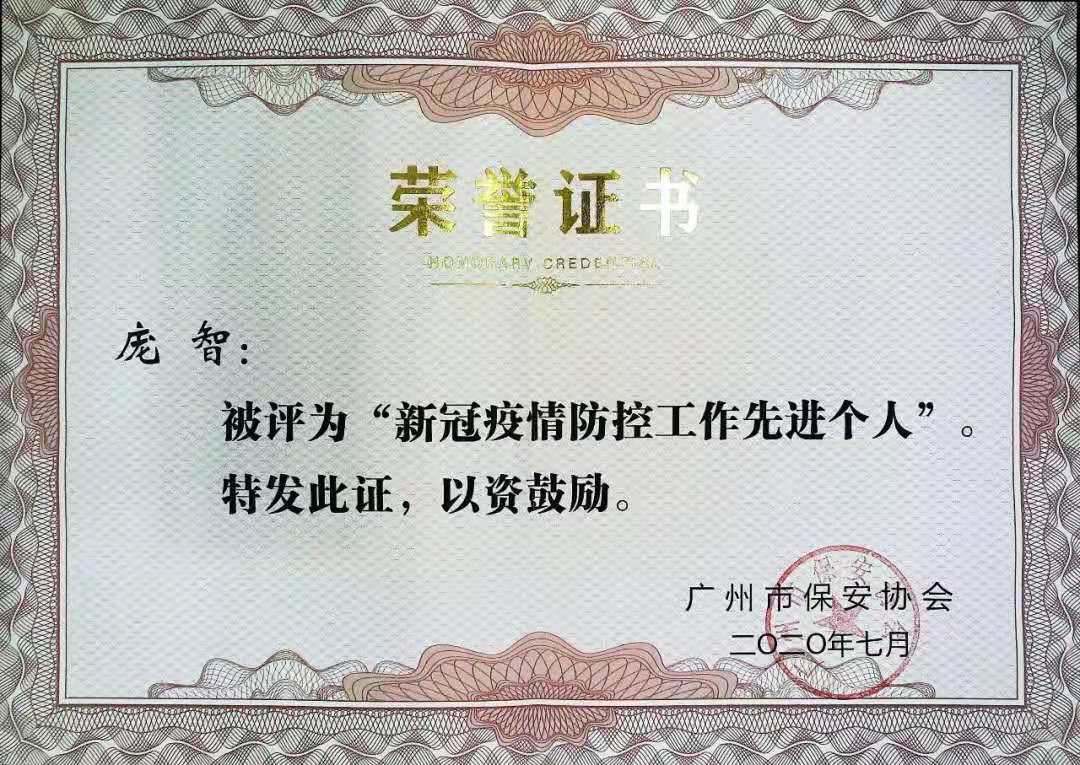 2020年7月,被廣州市保安協(xié)會(huì)評(píng)為“新冠疫情防控工作先進(jìn)個(gè)人”